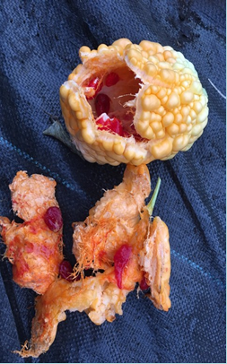 収穫した実を切ると衝撃的な赤のネバネバゼリーを纏った物にびっくり、思わず「キモチワルー!」叫ぶところでした。(ネバネバゼリーの中には種有り)