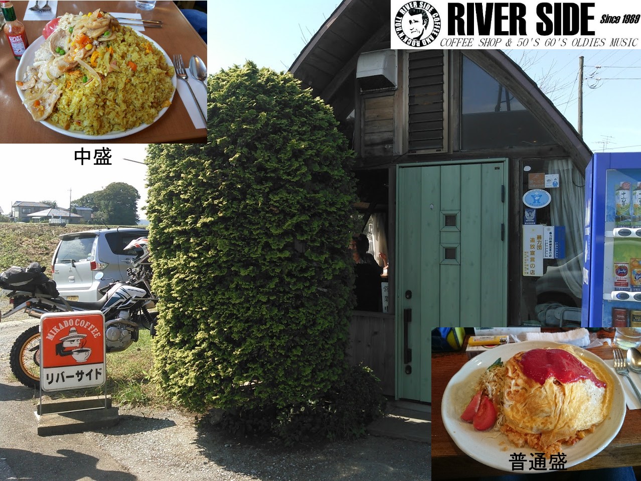 場所は当社の近くで、利根川を渡り布佐駅の目の前を通過し、手賀川脇にある喫茶店「リバーサイド」 まあ、川の横でそのままズバリのお店は、ログハウス風の建物でリーゼントのマスターが出迎えてくれる。 ここは、以前挑戦のデカ盛りのお店・・・。
