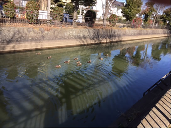 雨の日、雪の日などは休みますが、休日は明るくなってから出発をします。 何時も通る、遊歩道がある"逆川"でカモが泳いでいます。また、春になるとサクラ並木が現れ景色を楽しめます。