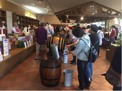 次に、立ち寄ったのが「シャトー勝沼ワイナリー」で、同じく工場見学をしましたが、葡萄酒の瓶詰めラインは休日で動いておりませんでした。ヨーロッパから輸入した大きい樽にはワインが眠っており、高い物は1樽で200万円するそうです。見学後、お楽しみの「ワイン試飲」に臨みました。試飲用グラスを受け取り、樽から順番にロゼ、白、赤ワイン。また、新しく売り出したサクランボのワインなどを頂きました。お土産用のワインを購入し終了。