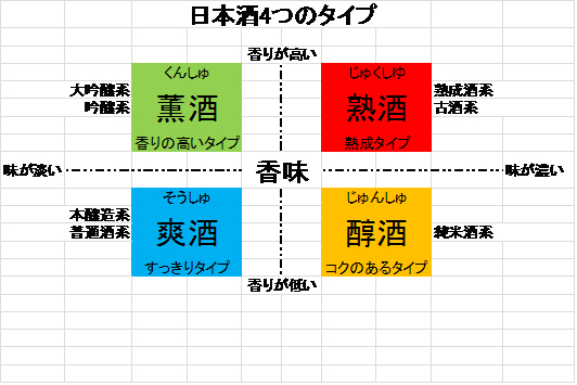 前回、日本酒は原材料やお米の精米歩合で8種類に区別されると言うお話しをさせて頂きましたが、今回は味や香りで4系統に分けられるお話しをしようと思います。