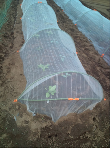 写真は白菜、キャベツの苗を植え、虫よけネットを張ったものです。