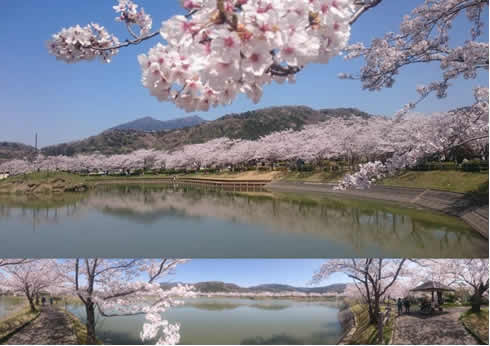 すぐ隣にある、平沢官衙遺跡の駐車場に停めて、桜の遊歩道を歩くと畔の芝生にシートを広げてお花見している方が居るのですが、足の踏み場もないとか、飲んで騒いでいる人も見た事が無いので、小さなお子さんが居る家族にも良い場所かもしれませんね。