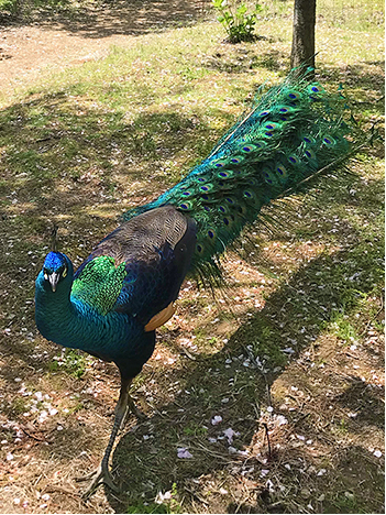 そして、その花々に彩りを添えているのが、境内で放し飼いにされている孔雀たち。木の枝や建物の屋根に留まったり、時々羽を広げたりと自由に動きまわりながら見事にこの場の風景に溶け込んでいます。
