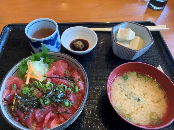 帰り道で食べた、マグロぶつ切り丼と鯛餃子。鯛餃子はさっぱりしていて超絶品、マグロ丼も最高にうまい。