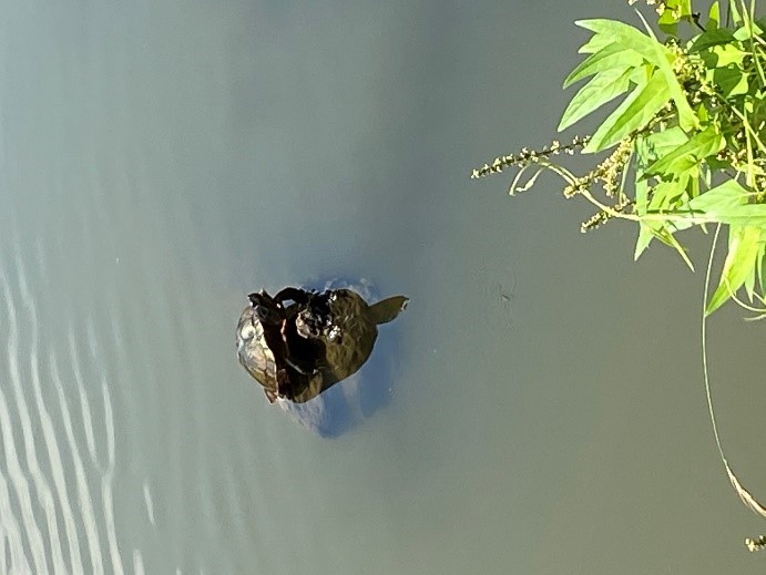 公園内を歩いていても、こちらもいつもより人は少ない印象です。そんな中、池の周りを歩いているとカメ発見。