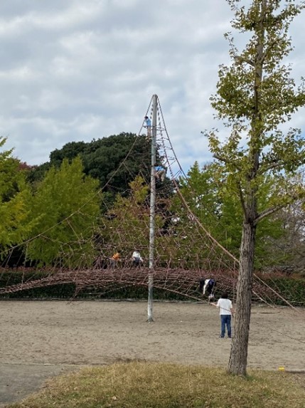 テニスコートの隣には立体的なクモの巣に子供たちが登って遊んでいます。
