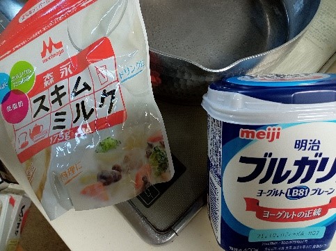 沸騰したお湯の粗熱を取りヨーグルトとスキムミルクを混ぜ合わせ、発酵させます。