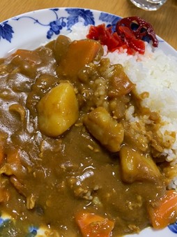 今回の写真は休みの日に作ってくれたカレーです。野菜の切り方が分からなくて大小様々な人参と皮が所々付いたジャ