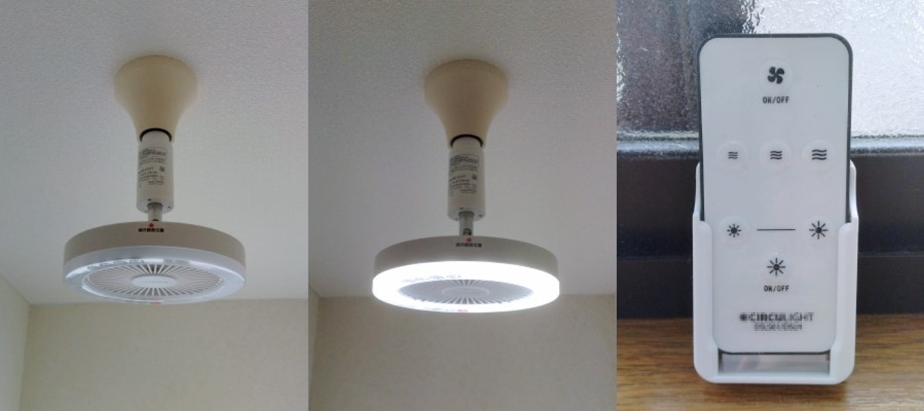 明るさが2段階、風量は3段階、前回の設定を保持するので、壁のスイッチだけでファンが回るし、ファン不要な時期に