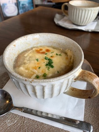 手作りのオニオングラタンスープはチーズたっぷりで優しいお味でした