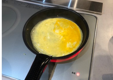 焼きあがったソーセージを皿に移し、同じフライパンで卵を薄くクレープ状に焼いていく
